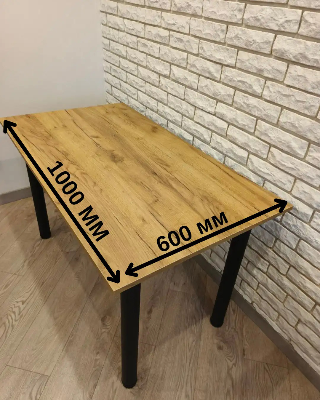 Сучасний кухонний стіл із міцними металевими ніжками та стильною ламінованою стільницею під «золотий дуб» або «бетон». Має жорстку, стійку конструкцію, екологічну стільницю товщиною 18 мм, оброблену ударостійкою кромкою.